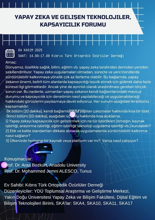 “Yapay Zeka ve Gelişen Teknolojiler, Kapsayıcılık Forumu” 4 Kasım 2025 tarihinde Kıbrıs Türk Ortopedik Özürlüler Derneği ev sahipliğinde gerçekleştirildi. Forumda, yapay zekânın sağlık, eğitim ve bilim alanlarında kapsayıcılığı nasıl güçlendirebileceği ele alındı.